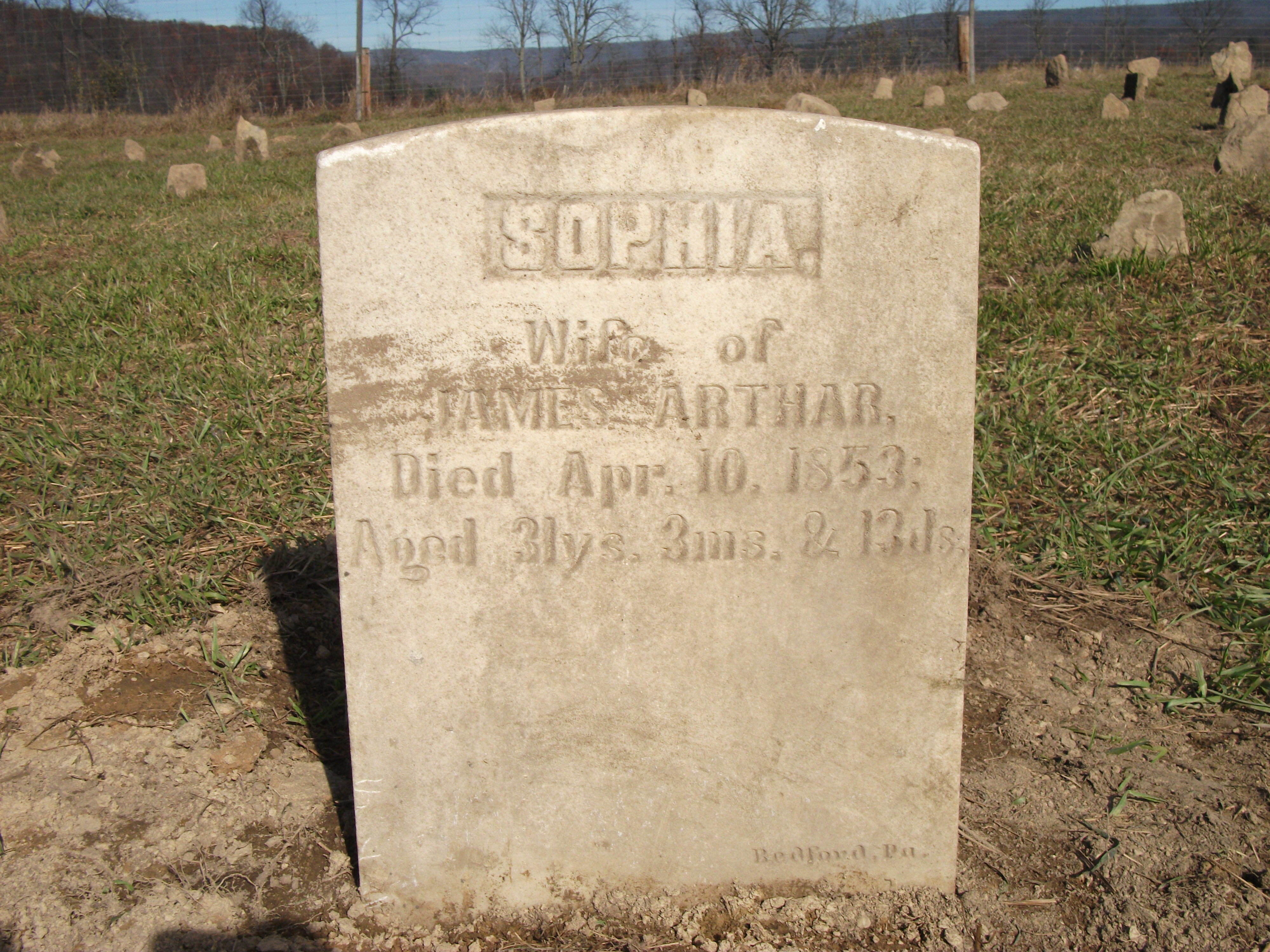 Sophia wife of James Arthar (Arthur) d. 4/10/1853 aged 31 years 3 months 13 days