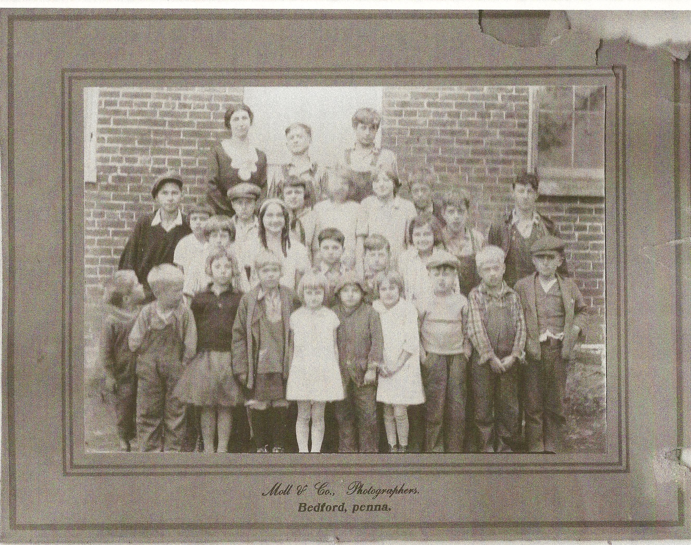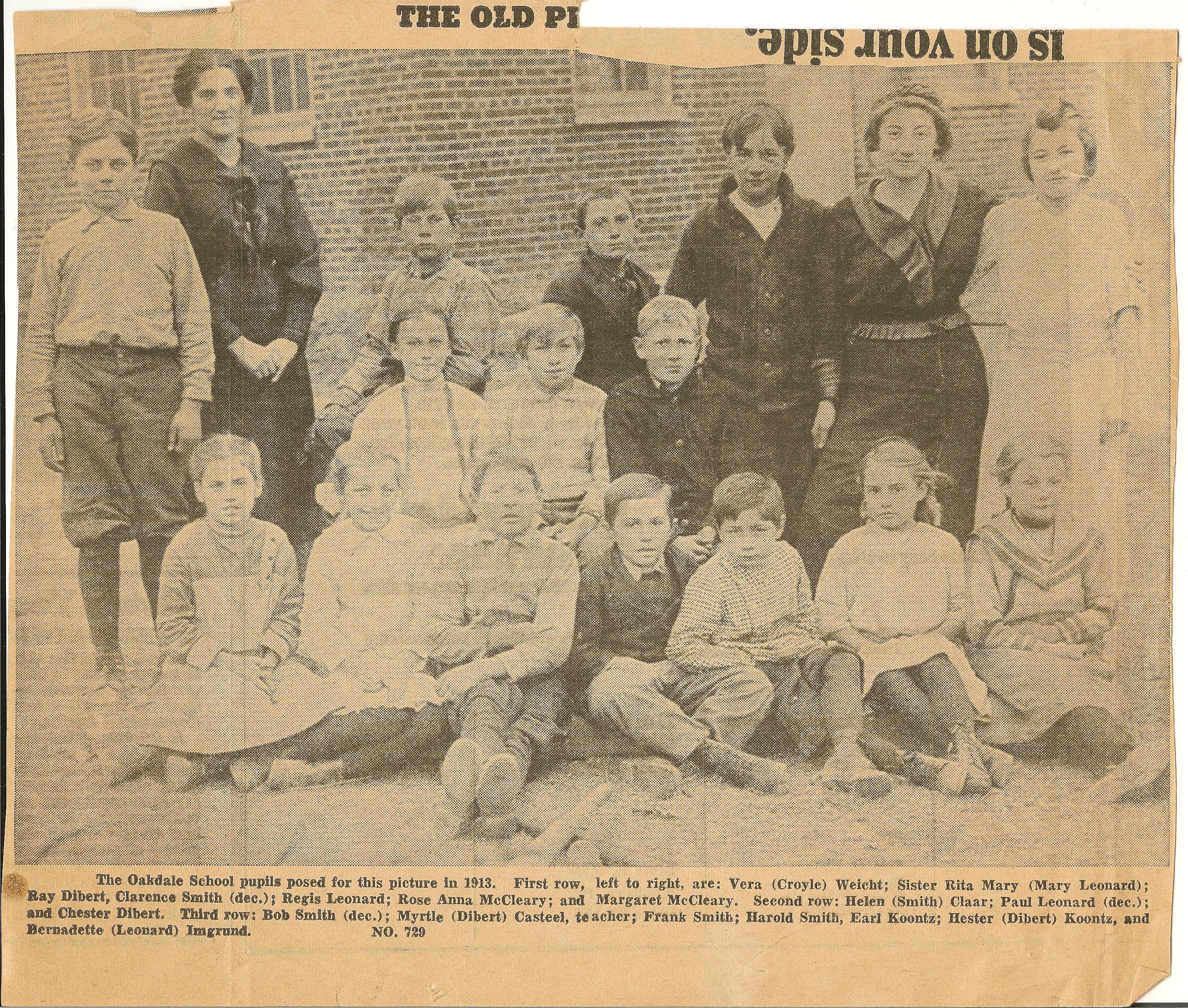 Oakdale (also known as Greendale) School 1913 (from Bedford Gazette on unknown date) - Row 1: Vera Croyle, Mary Leonard, Ray Dibert, Clarence Smith, Regis Leonard, Rose Anna McCleary, Margaret McCleary. Row 2: Helen Smith, Paul Leonard, Chester Dibert. Row 3: Robert Smith, Teacher Myrtle Dibert Casteel, Frank Smith, Harold Smith, Earl Koontz, Hester Dibert, Bernadette Leonard.